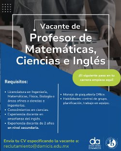 Profesor de Matemáticas, Ciencias e Inglés con experiencia mínima de 2 años en Secundaria.