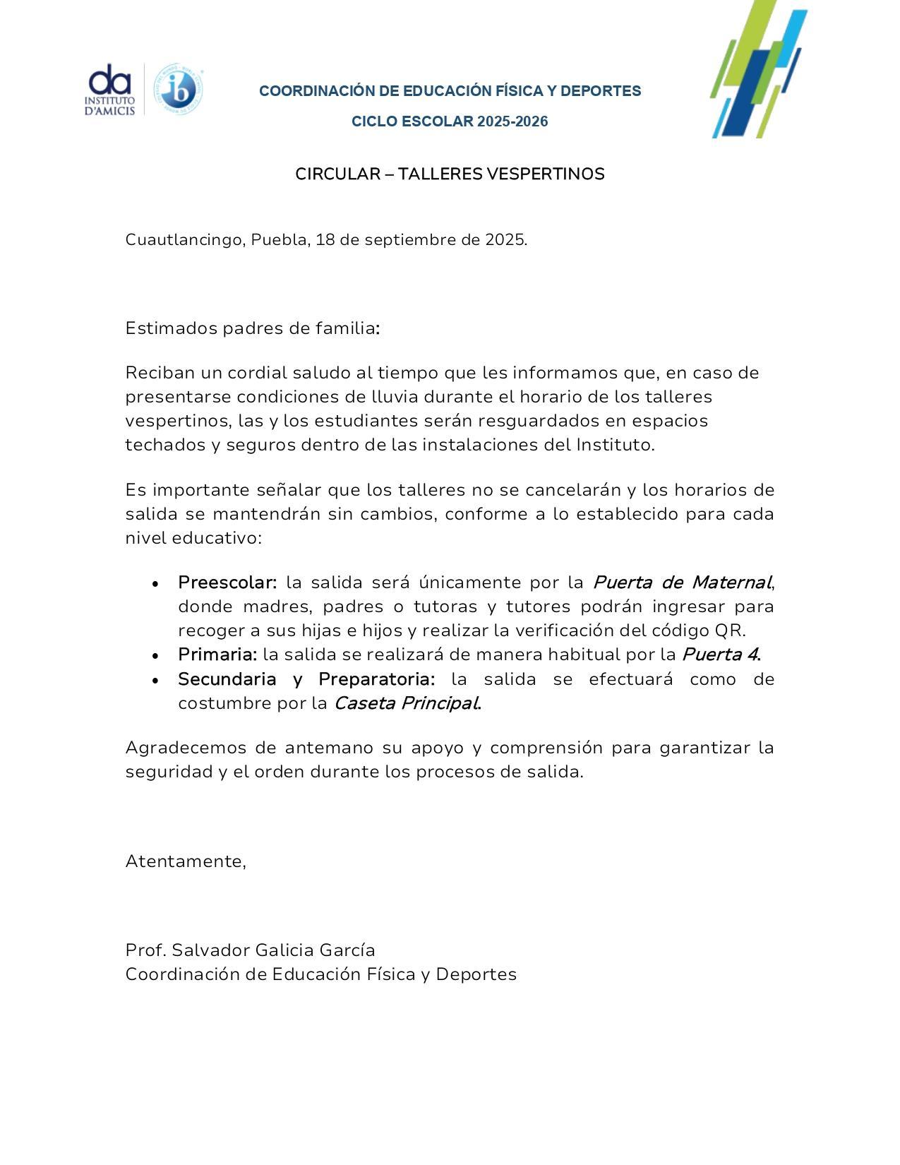 ¡INFORMACIÓN IMPORTANTE! #OrgullosamenteDAmicis#20AniversarioIBDiploma Archivos adjuntos CIRCULAR SALIDA TALLERES VESPERTINOS 180925.pdf