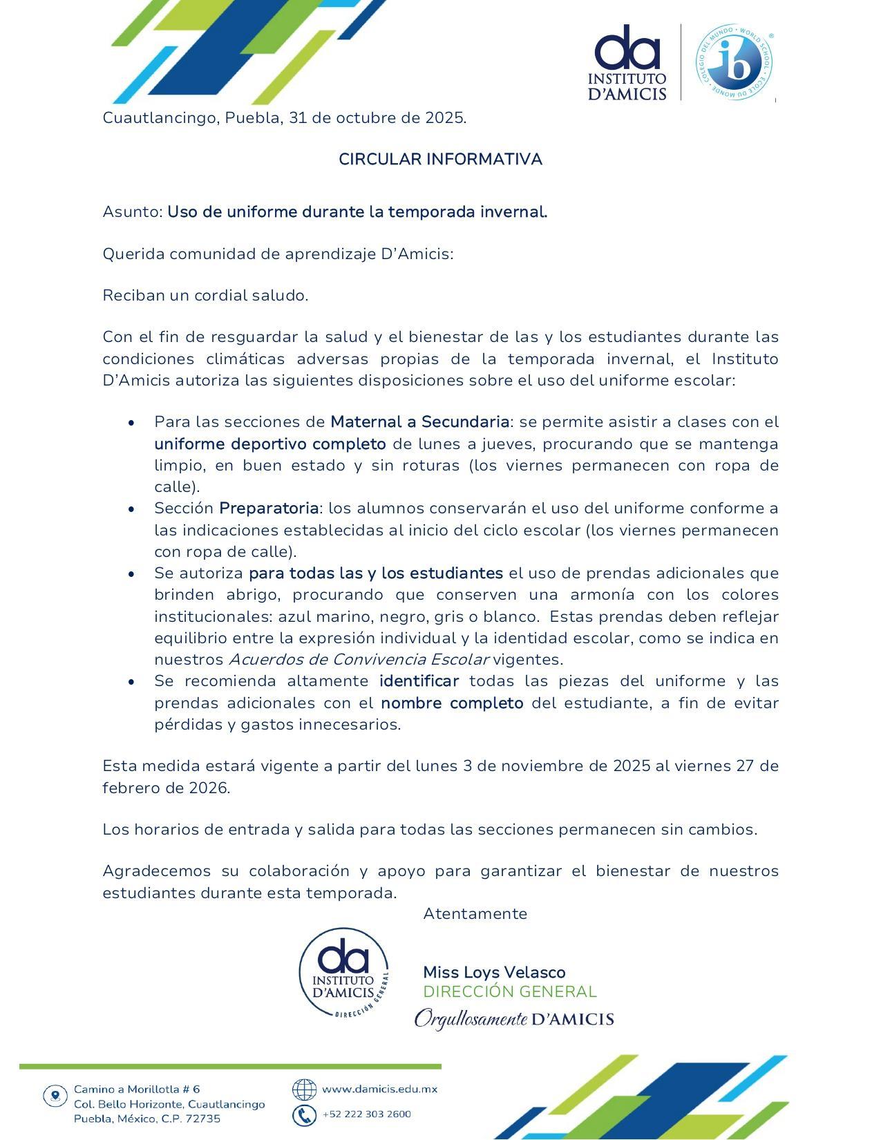 Uso de uniforme durante la temporada invernal #OrgullosamenteDAmicis#20AniversarioIBDiploma Archivos adjuntos Circular informativa temporada invernal.pdf