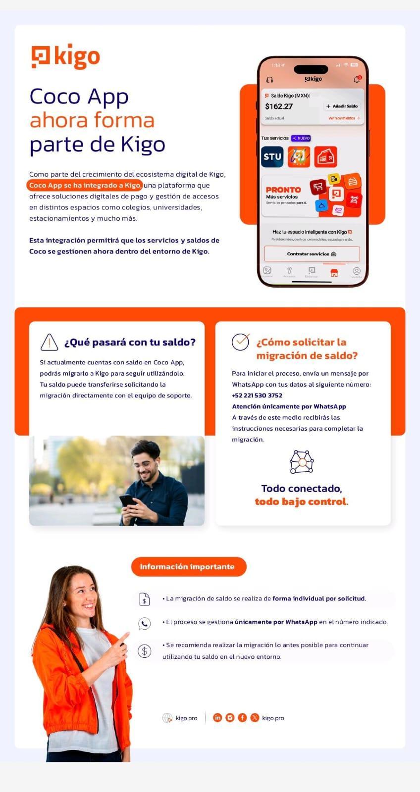 Respecto a la migración del saldo de Coco Lunch y Coco App a Kigo los usuarios que hayan quedado con saldo, posterior al día 24 de abril y que requieran migrar dicho saldo a la nueva aplicación (Kigo), tendrán que hacerlo a través del siguiente número de WhatsApp: